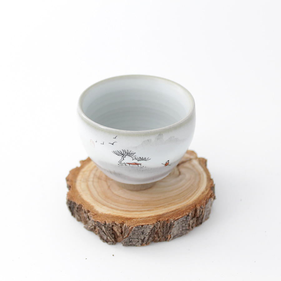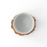 Крупная керамическая чашка с матовой серо-голубой глазурью жу яо и ручной росписью. Глазурь покрыта тонкой сетью трещинок, которые со временем заполнятся чаем и потемнеют.