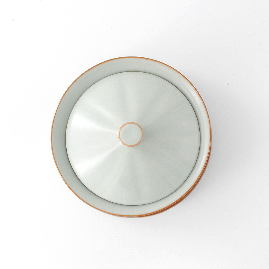 Небольшая изящная гайвань необычной формы. Толстая керамика Жу Яо голубого цвета с мягким, матовым свечением. Глазурь покрыта кракелюром - сетью трещинок, которые со временем заполнятся чаем и потемнеют.
